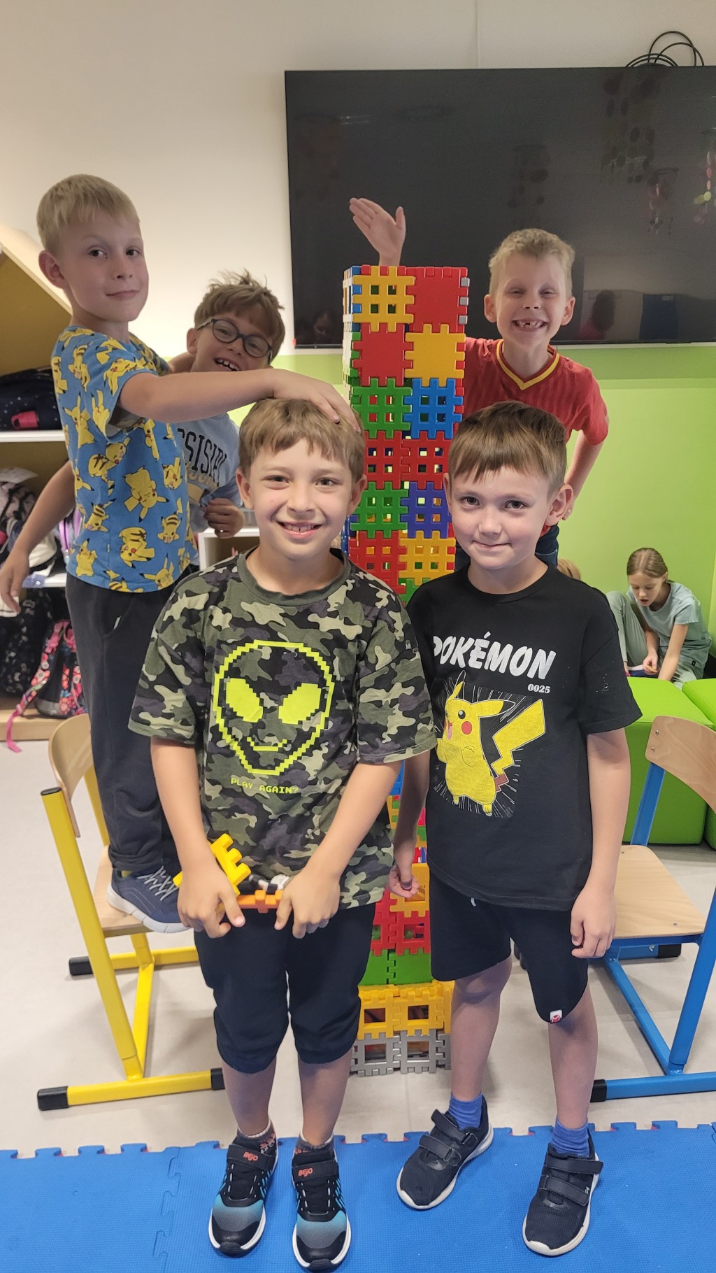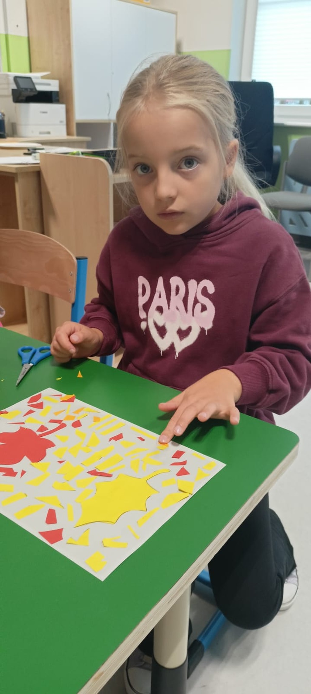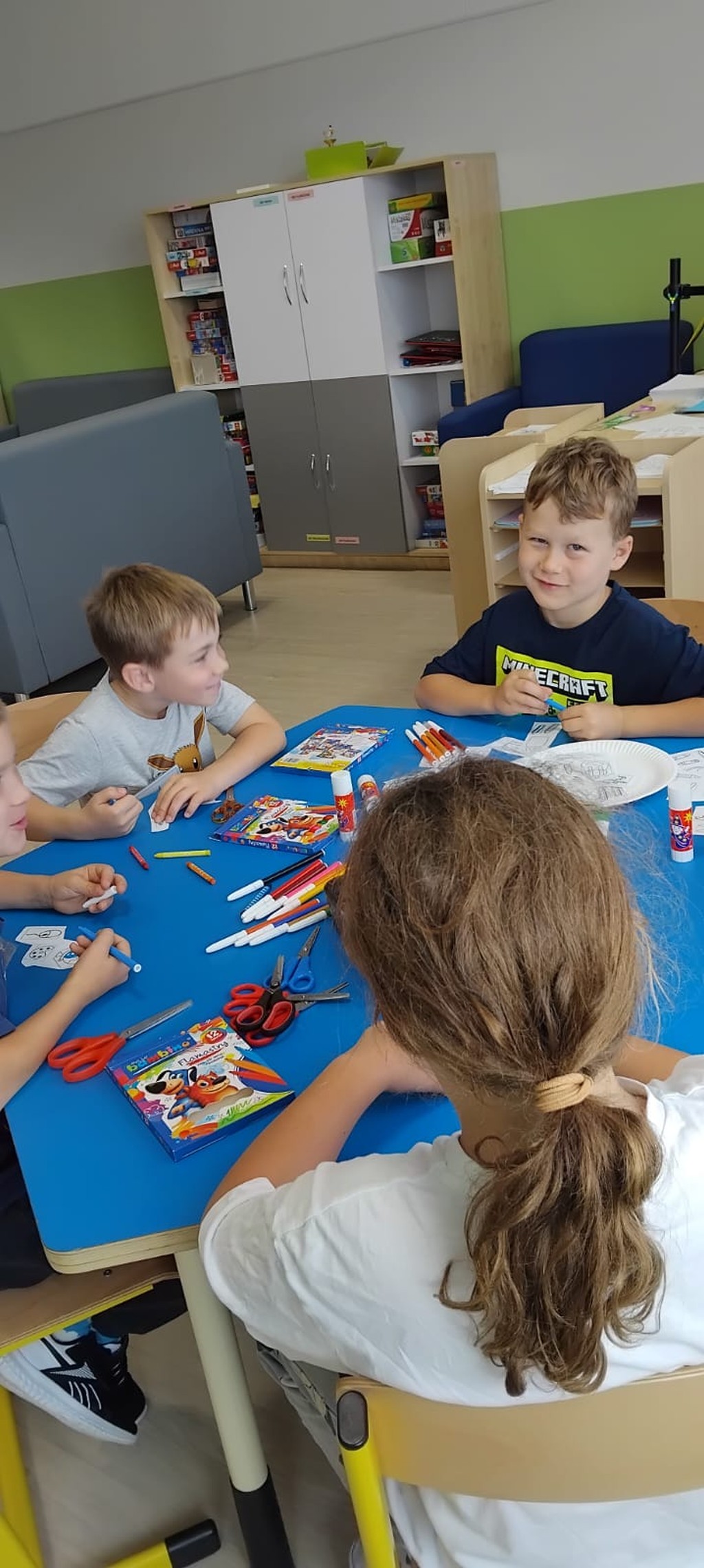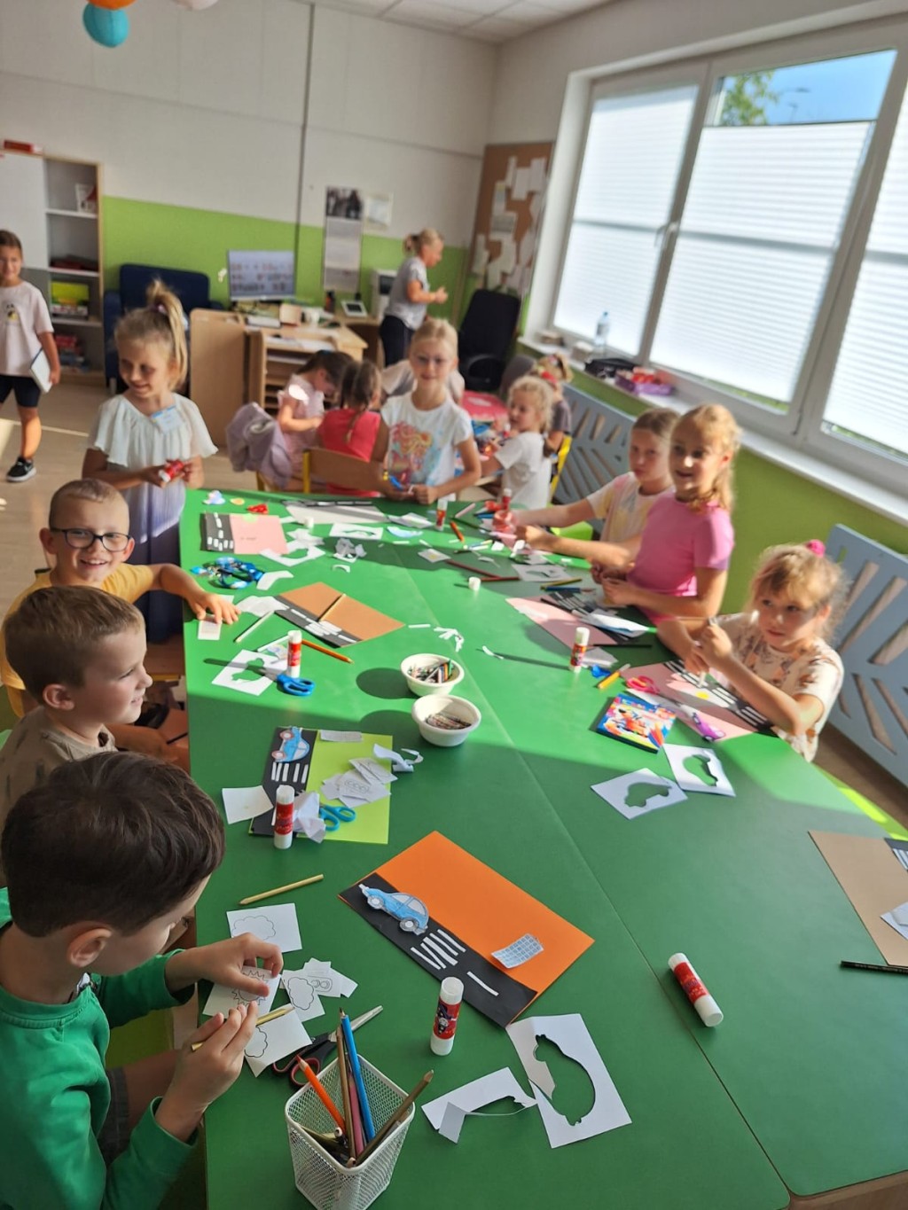 We wrześniu w naszej świetlicy szkolnej dzieci rozpoczęły nowy rok pełen zabawy i nauki. Na początku miesiąca omówiliśmy regulamin świetlicy oraz zasady panujące w szkole. Uczniowie przypomnieli sobie, jak ważne jest wzajemne szanowanie się i dbanie o wspólne bezpieczeństwo. Pierwszoklasiści mieli okazję poznać swoich nowych kolegów i koleżanki oraz zapoznać się z pomieszczeniem świetlicy. Rozmawialiśmy również o bezpiecznej drodze do szkoły i o tym, jak zachować ostrożność podczas przechodzenia przez jezdnię. W ramach zajęć plastycznych dzieci wykonały piękne prace z inicjałem swojego imienia. Następnie tworzyliśmy kolorowe zakładki do książek, które zachęcają do codziennego czytania. W kolejnym tygodniu inspirowaliśmy się jesienią, wykonując prace plastyczne przedstawiające barwne liście. Dzieci z zaangażowaniem wycinały, malowały i wyklejały swoje jesienne kompozycje. Nie zabrakło również czasu na gry i zabawy dowolne, które dostarczyły wszystkim wiele radości. Wrzesień minął nam w miłej, twórczej atmosferze. Z niecierpliwością czekamy na kolejne wspólne miesiące w świetlicy.